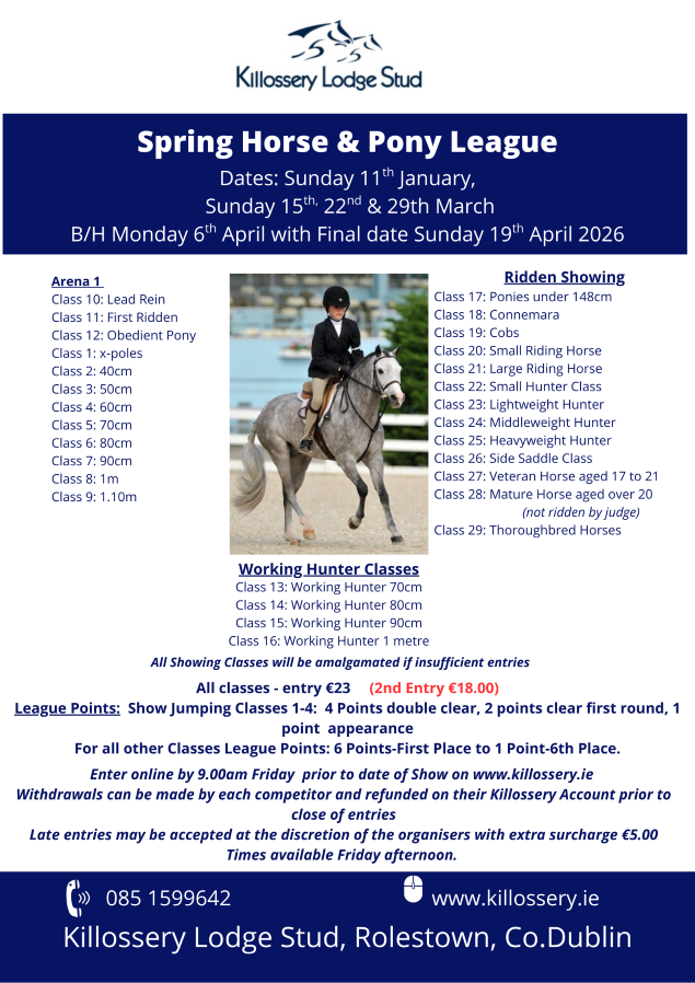 League points for the following Show Jumping classes given on placings 6 - 1st, 5 - 2nd, 4 - 3rd, 3 - 4th, 2 - 5th, 1 - 6th place. These classes will be timed in the 2nd round.