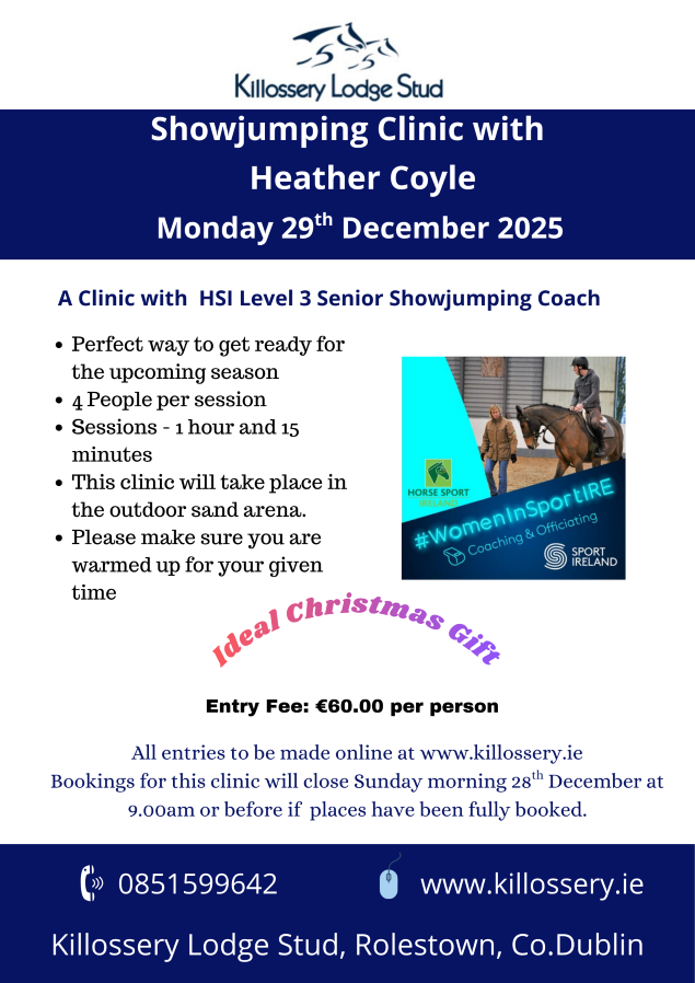 Heather coyle HSI coach will give a show jumping clinic on 29th December 4 per session €60 per person