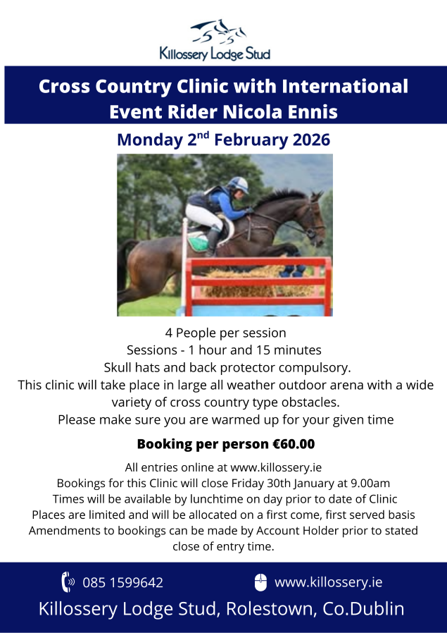 This clinic will be held in the sand arena over the arena eventing fences . Sessions will be 1 and 1/4 hours with approximately 4 per session.