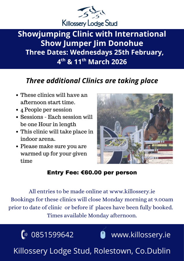 This is a show jumping clinic with Jim Donohue show jumping coach . Sessions will be held in indoor arena and will be 1 hour long with maximum 4 per session.